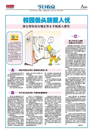 采访中,一名小学生家长对记者说:“我们自己一天到晚拿着手机玩个不停,对孩子的影响可想而知。有些孩子想着法儿找家长要手机,带到学校里玩。”