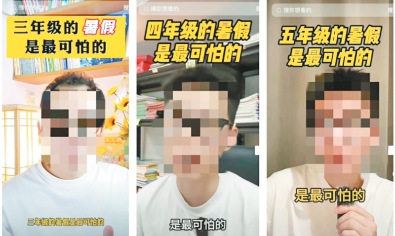 记者发现,广为流传的“暑假最可怕”系列,来自于一个个视频截图。这些视频中,“老师”们均一脸恳切、苦口婆心告诉家长,各个年级的暑假有多么“可怕”。