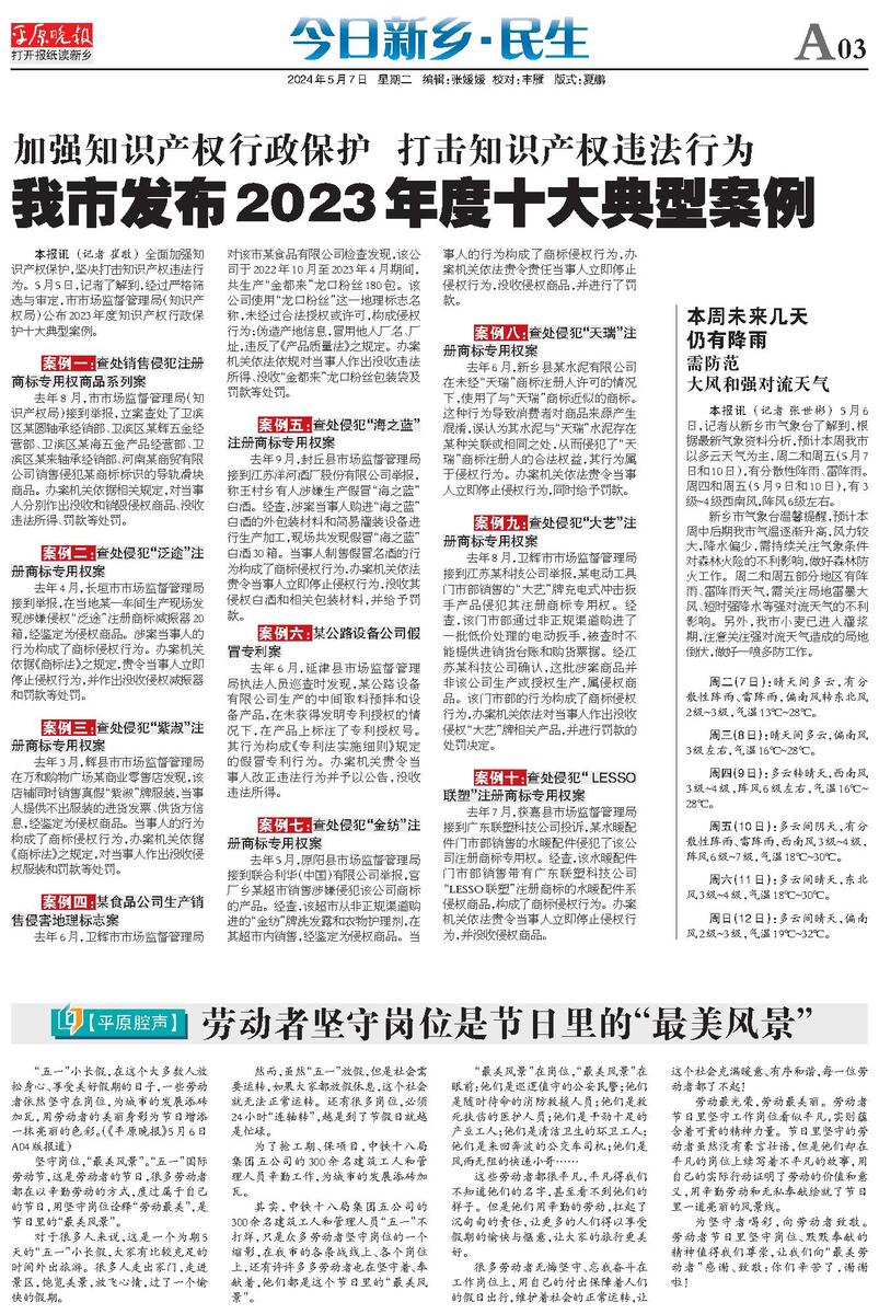 本报讯 (记者崔敬)全面加强知识产权保护,坚决打击知识产权违法行为。5月5日,记者了解到,经过严格筛选与审定,市市场监督管理局(知识产权局)公布2023年度知识产权行政保护十大典型案例。