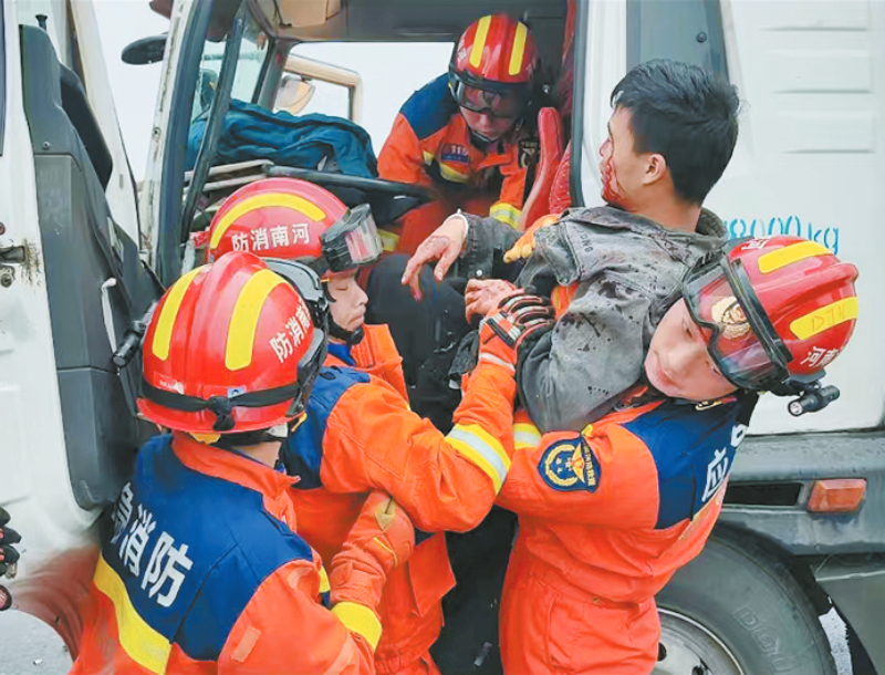 消防救援人员经过研判后,先使用液压剪切钳将货车车门剪开,然后利用绞盘牵引消防拖拽绳,将小货车车头与前车分离,打开了司机被困空间。随后,消防救援人员将被困司机从车上抬下,移交给现场医护人员送往医院进一步检查治疗。