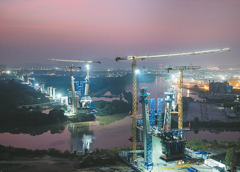 广佛西环线广州炭步白坭河特大桥主墩双索塔浇筑施工现场(12月10日摄,无人机照片)。