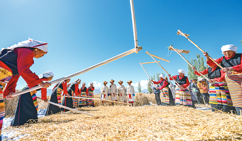 9月23日,在西藏拉萨市林周县强嘎乡典冲村,当地农民用传统方式打场。