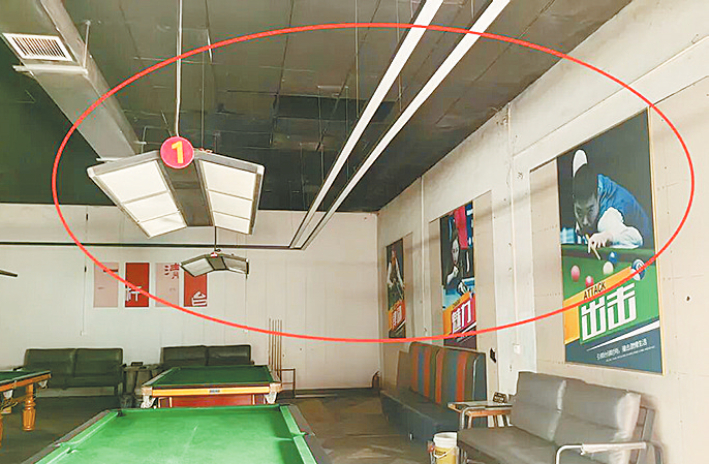 位于新乡县小冀镇文化路东段的新乡县小冀镇中八台球厅存在的火灾隐患:未设置火灾自动报警系统,应急照明灯损坏,北侧窗户违规设置防盗窗,西侧安全出口违规设置卷帘门(如图2)。