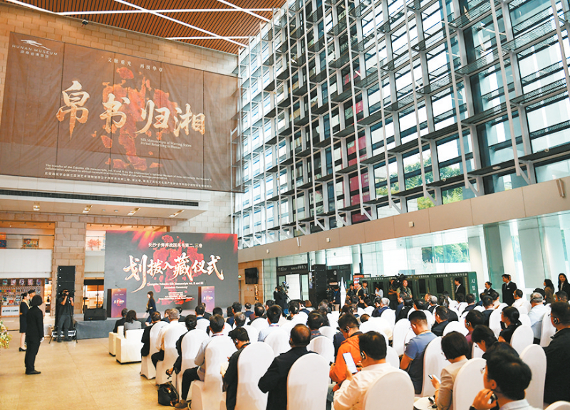 这是10月13日在湖南省博物馆拍摄的长沙子弹库战国帛书第二、三卷划拨入藏仪式现场。