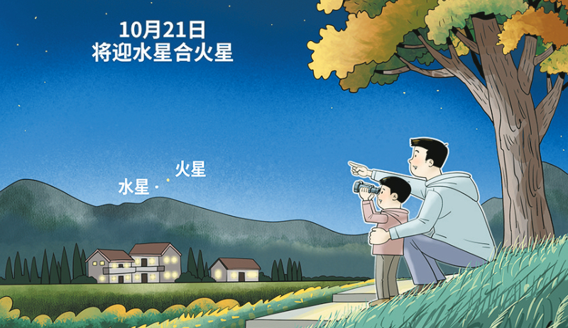 10月21日将迎水星合火星。当天日落后,水、火两星将“携手”出现在西南方低空,我国公众有机会看到水星、火星一明一暗“同框”的“星空约会”。