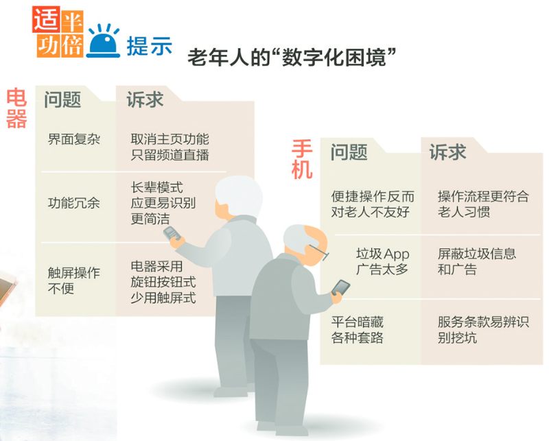一台电器、一部手机,各种服务和功能层出不穷,许多老人却无法享受;界面繁杂,操作困难,成了将老人割裂于数字时代之外的罪魁祸首;有些产品虽然推出了适老模式,但实际效果仍不尽如人意;面对“数字化困境”,有的老人想自行摸索破局,但往往又会遭遇各种问题。