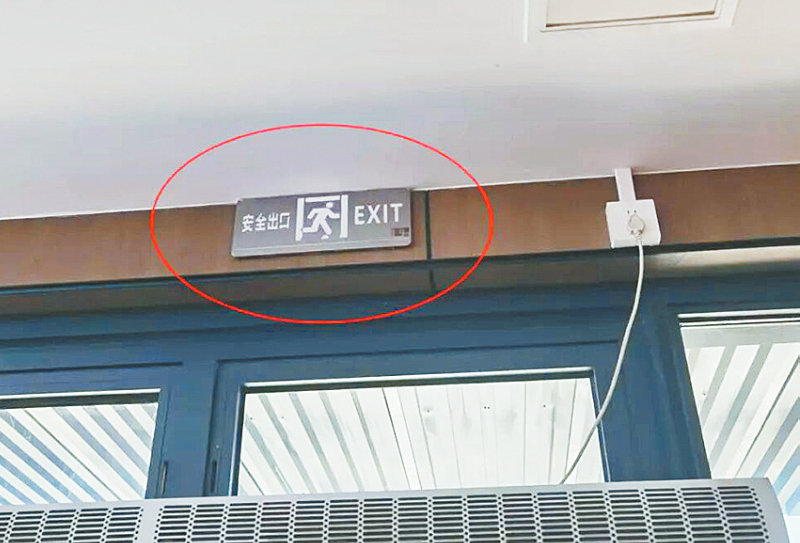 位于平原示范区太行大道与淮河路交叉口康养街的临风同胜祥餐饮店存在以下火灾隐患:缺少一个安全出口;感烟探测器防尘罩未摘除;安全出口标志灯不亮(如图2)。