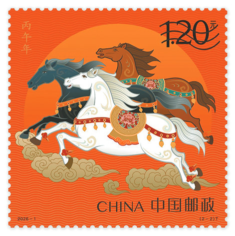 《丙午年》特种邮票由王红卫、赵恩重设计。邮票中的骏马既展现出“一马当先”的开拓气概,也诠释了“万马奔腾”的团结力量,将马的形象与新时代中国人民奋发进取的精神风貌完美融合于方寸之间。