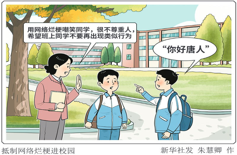 前不久,重庆一名初中教师在社交平台上发布抵制网络烂梗进校园的视频,引发广泛关注。这位教师在视频中称,班上有学生用“唐人”“你好唐人”等网络烂梗嘲笑同学,这种行为实在不妥,很不尊重人,希望班上同学不要再出现类似行为。