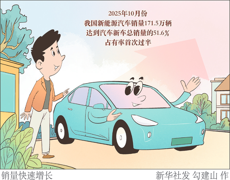 新华社北京11月11日电(记者唐诗凝)中国汽车工业协会11月11日发布数据显示,2025年10月份,我国新能源汽车产销同比保持快速增长,新能源汽车新车销量达到汽车新车总销量的51.6%,占有率首次过半。