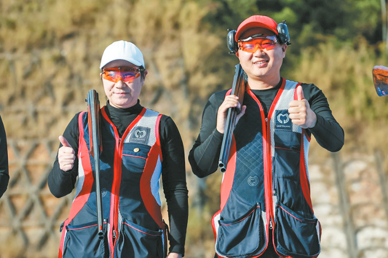 11月20日,郭雨浩(右)/刘英姿在赛后庆祝。当日,在射击项目飞碟多向混合团体金牌赛中,湖南队组合郭雨浩/刘英姿战胜陕西队组合肖金佳/段宇薇,夺得冠军。 新华社记者潘昱龙摄