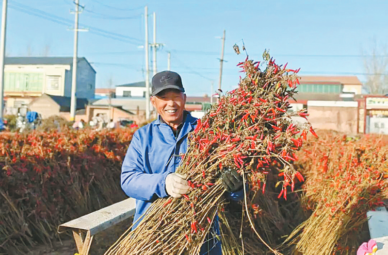 辣椒产业兴旺让种植户增收,也给村内老年人带来了就业机会。74岁的张守平手法娴熟地摘下辣椒放进筐里,他是采摘队伍中的一员,每天相对轻松的工作量,让他和其他20余名老年人有了额外收入,在老有所为中收获了幸福感与归属感。