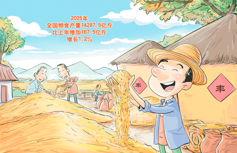 12日,国家统计局发布全年粮食生产的“成绩单”——2025年,全国粮食产量达到14297.5亿斤,比去年增加167.5亿斤,增长1.2%。