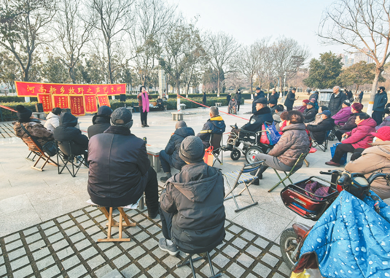 本报讯 (记者 刘志松)12月17日下午,冬日暖阳下,牧野广场上歌声嘹亮,掌声阵阵。数十位中老年人围坐在一起,兴致勃勃地观看文艺演出(如图),这是“牧野之声艺术团”在进行日常义务演出。