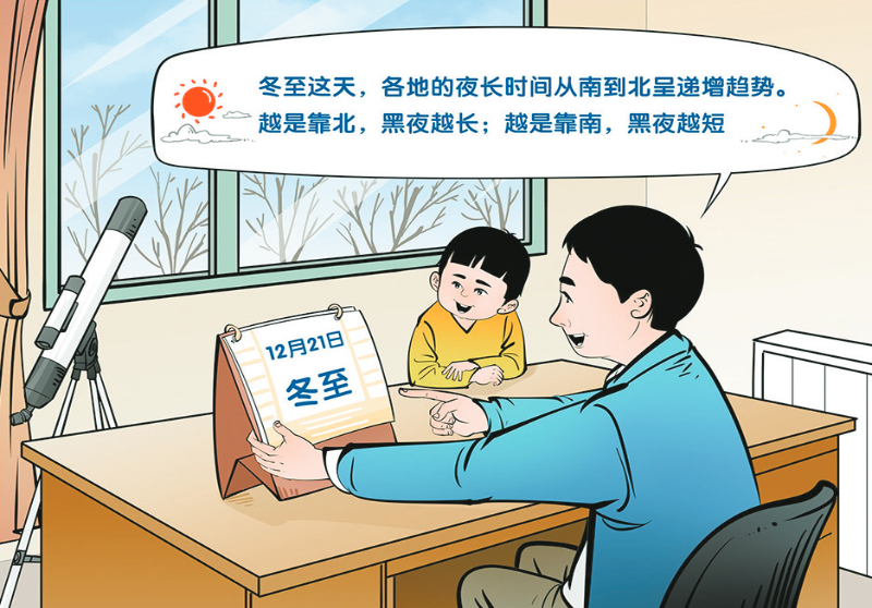 冬至是二十四节气中的第二十二个节气,也是冬季的第四个节气。中国天文学会会员、天津科学技术馆天文科普专家刘仲利介绍,冬至这天,各地的夜长时间从南到北呈递增趋势。越是靠北,黑夜越长;越是靠南,黑夜越短。这是因为地球围绕太阳公转,地轴是倾斜的,导致太阳直射点在地球的南北回归线之间往复运动,进而表现为各地的昼夜长短不一。